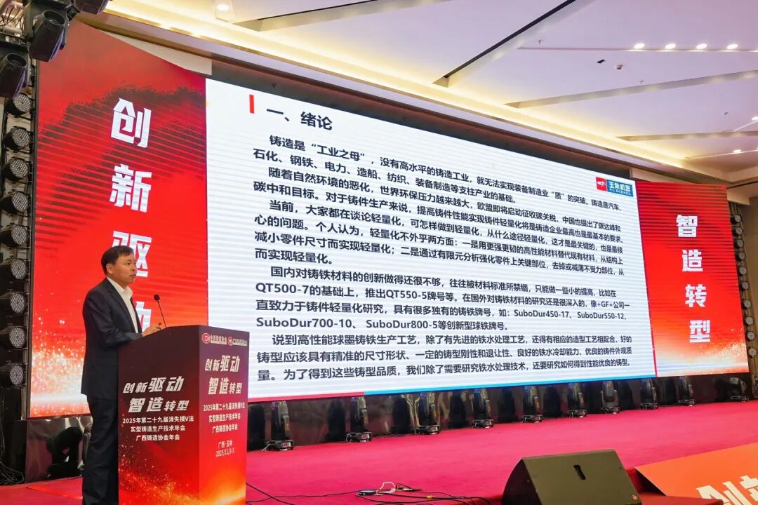今年是“十四五”规划的收官之年,也是谋划“十五五”发展的关键节点。“十五五”规划的逻辑框架,是坚持高质量发展,以新发展理念引领发展,因地制宜发展新质生产力,推动经济持续健康发展和社会全面进步。在此背景下,消失模V法实型铸造及广西铸造行业的发展如何在工艺创新、材料创新、装备智能化、数字化结合等路径上实现突破,推动产业整体升级,正是本次年会“创新驱动、智造转型”主题所要深入探讨的方向,年会上各铸协领导、企业家代表、铸造专家等通过主题报告、技术报告等形式,与参会的铸造同仁们共同交流、凝聚共识。